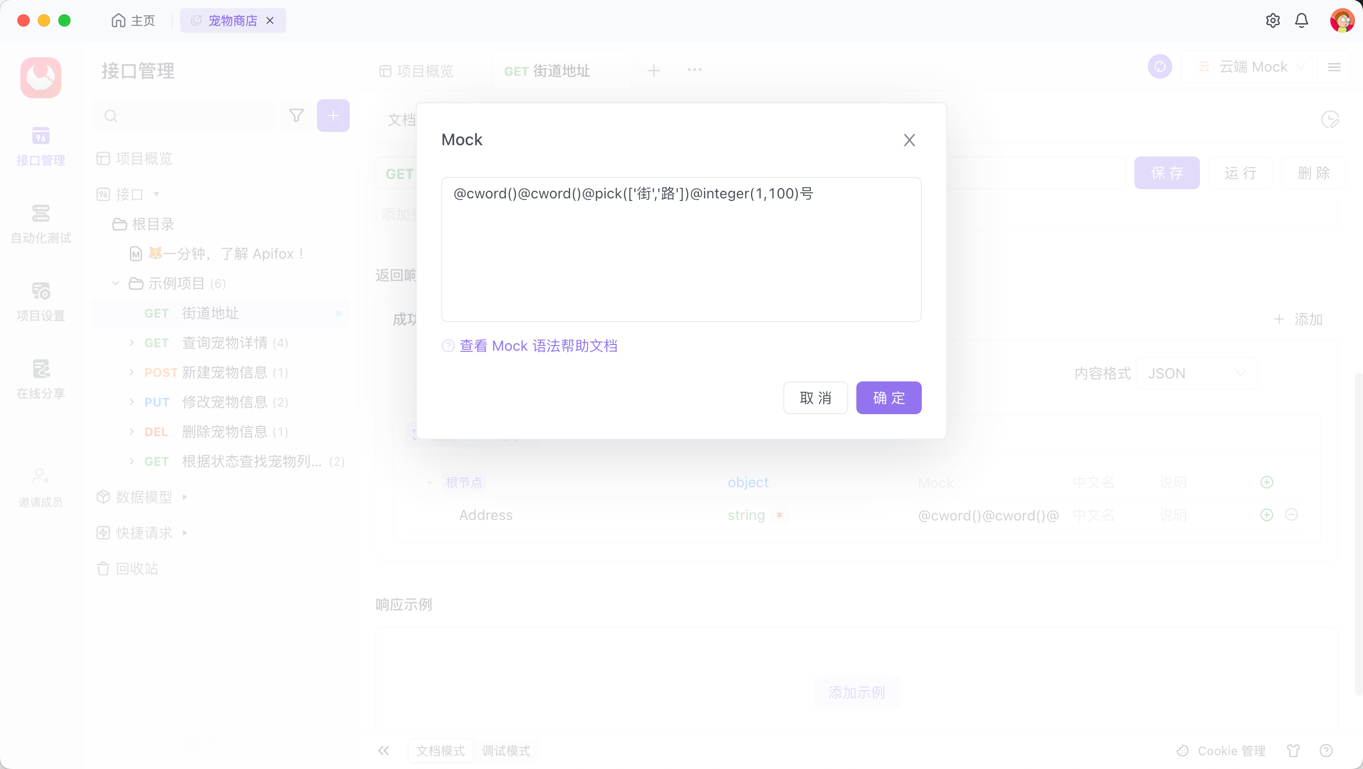 同理,当预期返回带省市的街道地址,则输入 @county(true)@cword()@cword()@pick(['街','路']) @integer(1,100) 号