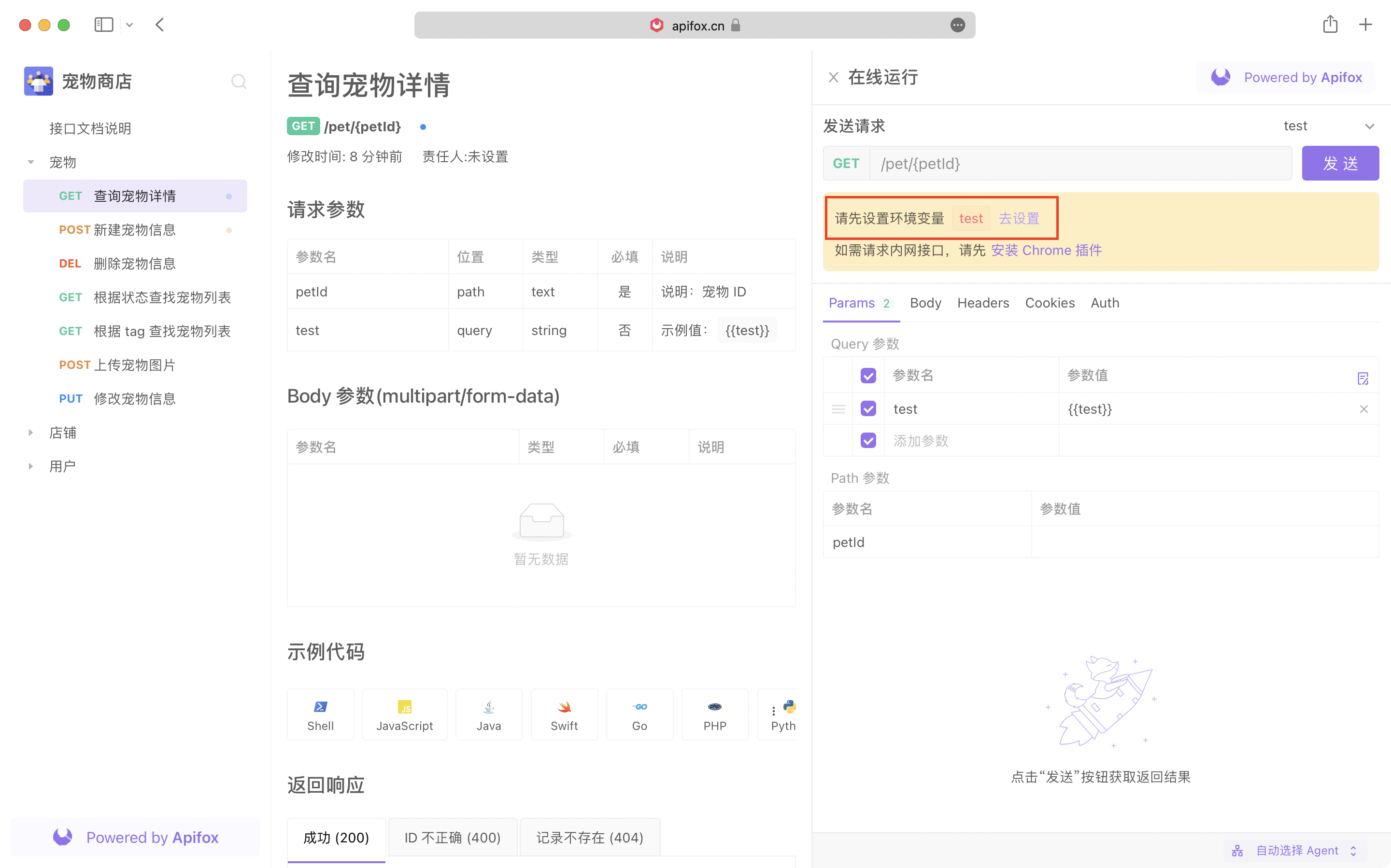 - 运行环境:可以选择运行的环境,和显示对应的前置 URL。选择后,分享出去的在线接口文档支持运行调试