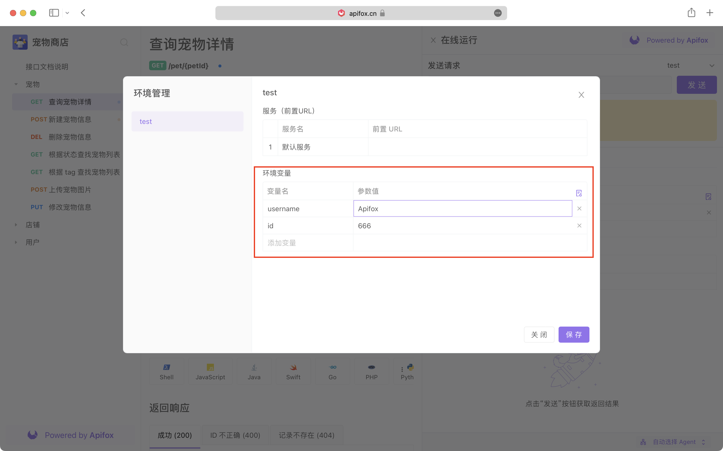 在线文档调试接口时,会存在修改接口文档引用的 环境变量 的场景,现在可以根据下图,修改 环境变量 并运行调试