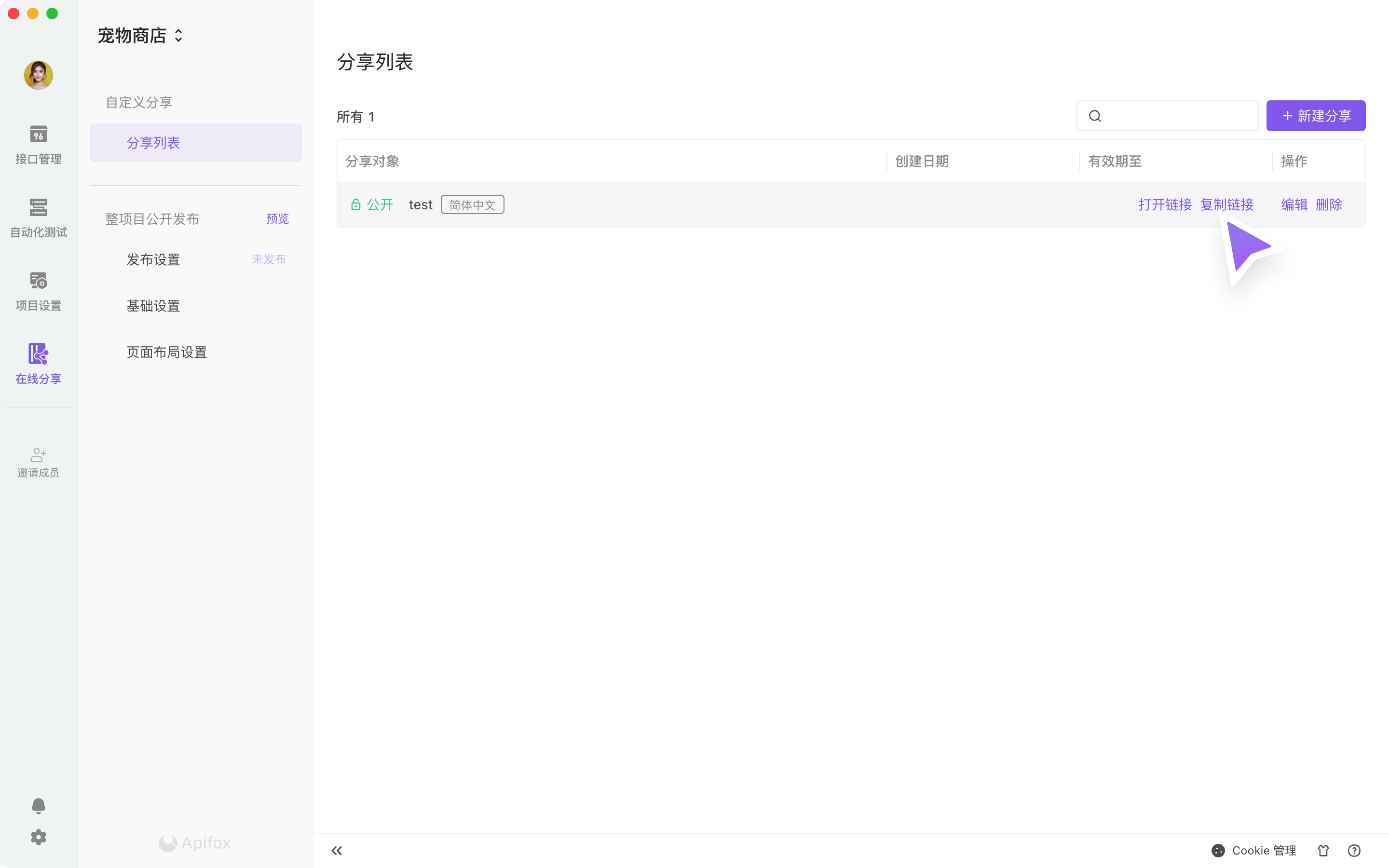 - 分享范围:可以选择项目全部,也可以选择部分接口,也可以根据标签维度导入