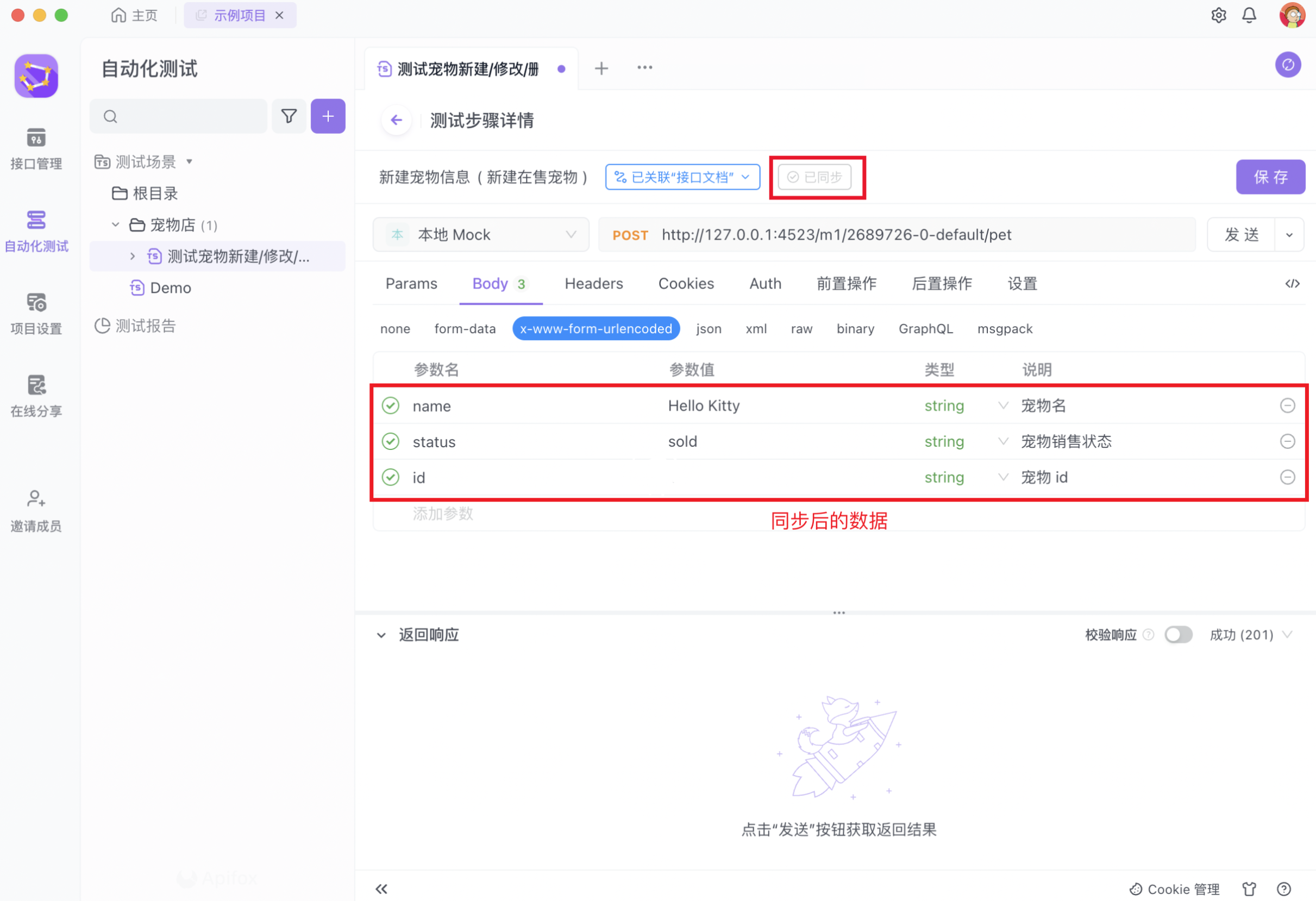 触发手动同步后,测试步骤将同步接口文档中的数据,包括“参数名”“前后置脚本”等内容。注意同步的对象是接口文档,如果接口文档的请求参数中没有设置示例值的话,同步内容是不包含“参数值”的。