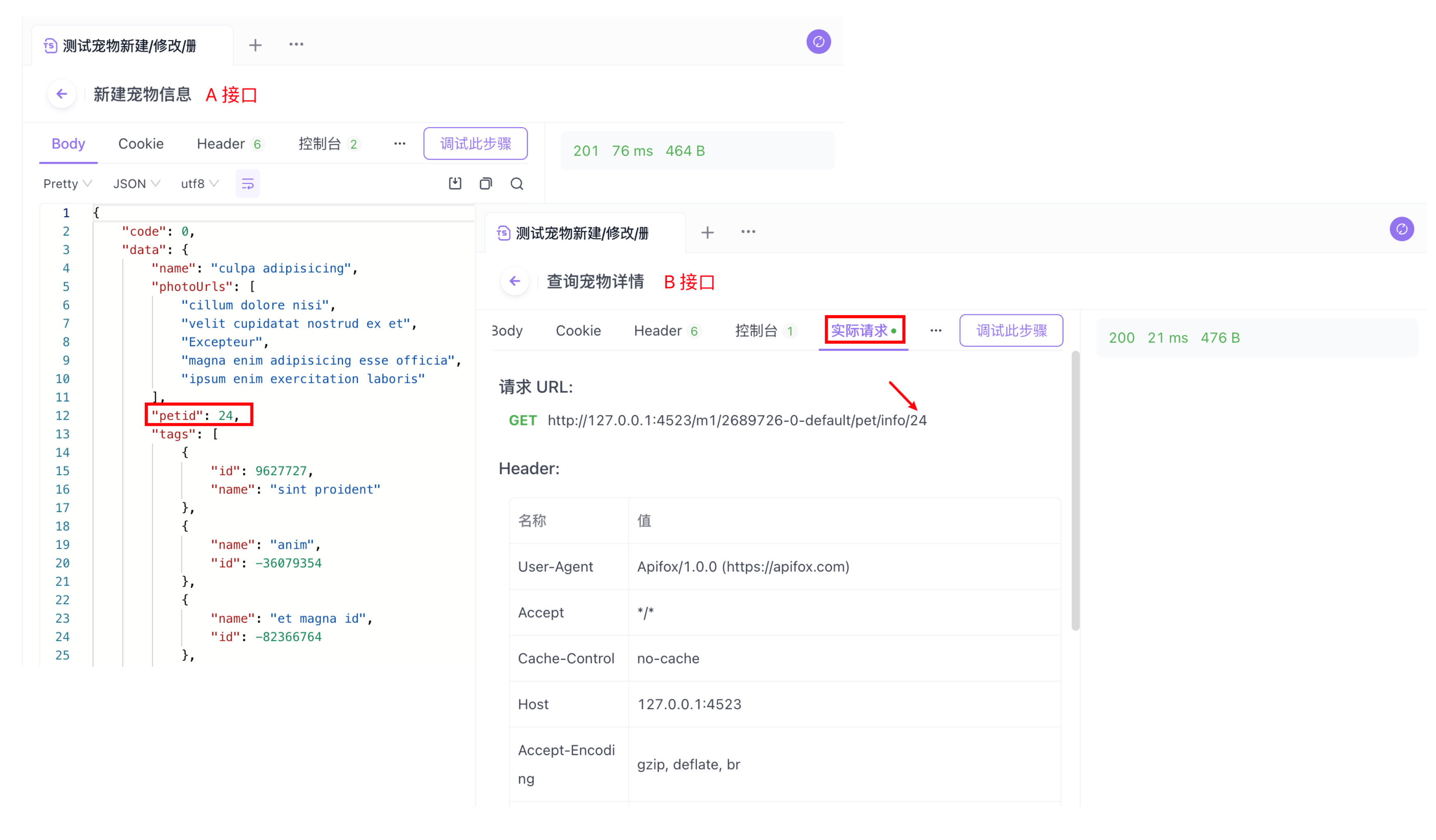 你可以在测试报告中查看参数的传递情况。可以看到 A 接口 输出的 petId 参数值为 24,而 B 接口 的实际请求值同样为 24,参数传递成功。
