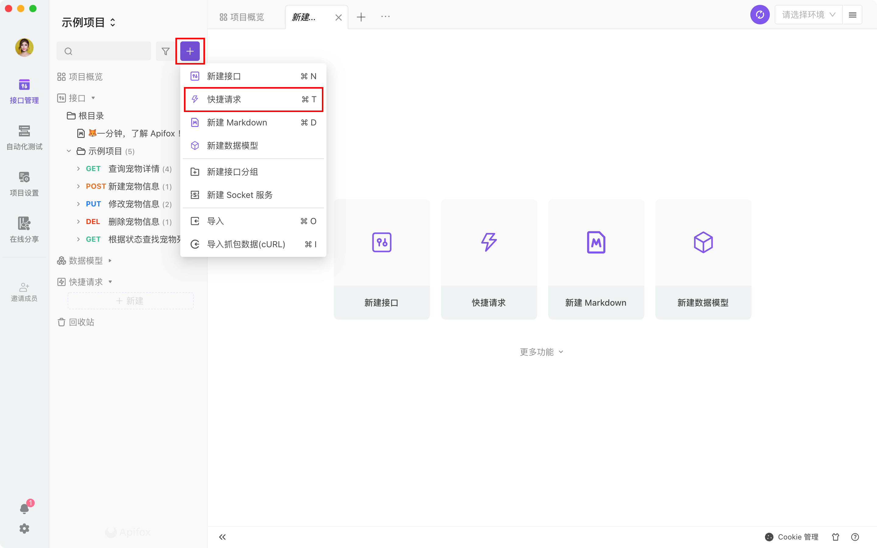 接口调试快捷请求本页总览快捷请求视频内容下文将以一个简单的 HTTP 接口为例,详细说明如何使用 Apifox 发起接口请求并接受调试响应。新建快捷请求鼠标移到左侧搜索框旁边的 + 号按钮,在下拉列表里选择快捷请求。你也可以将鼠标移动到左下侧的功能菜单,并在快捷请求右边点击 + 号按钮。输入接口 URL 及参数后轻点“发送”按钮。发送请求后查看响应结果。注意如果输入的 URL 未添加 http:// 或 https:// 作为起始参数,那么实际发出请求的时候将会自动加上当前环境中的前置 URL。保存为接口调试完成后,若此接口可以在后续复用,可以选择保存为快捷请求或接口文档在左侧目录管理已保存的快捷请求。