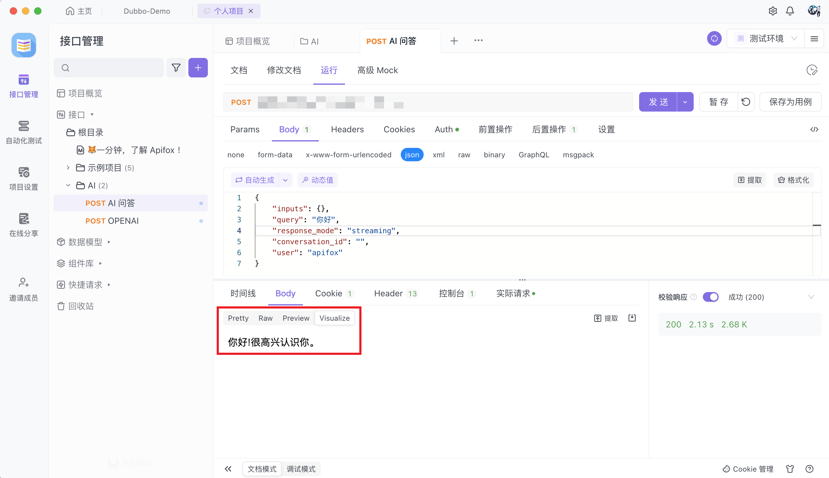 在 HTTP 项目中新建接口。发起请求后,当接口返回的 Content-Type 包含 text/event-stream 时,Apifox 会自动将返回的数据解析为 SSE 事件,并以全新的时间线视图实时更新响应内容,而不必等待服务器关闭连接。