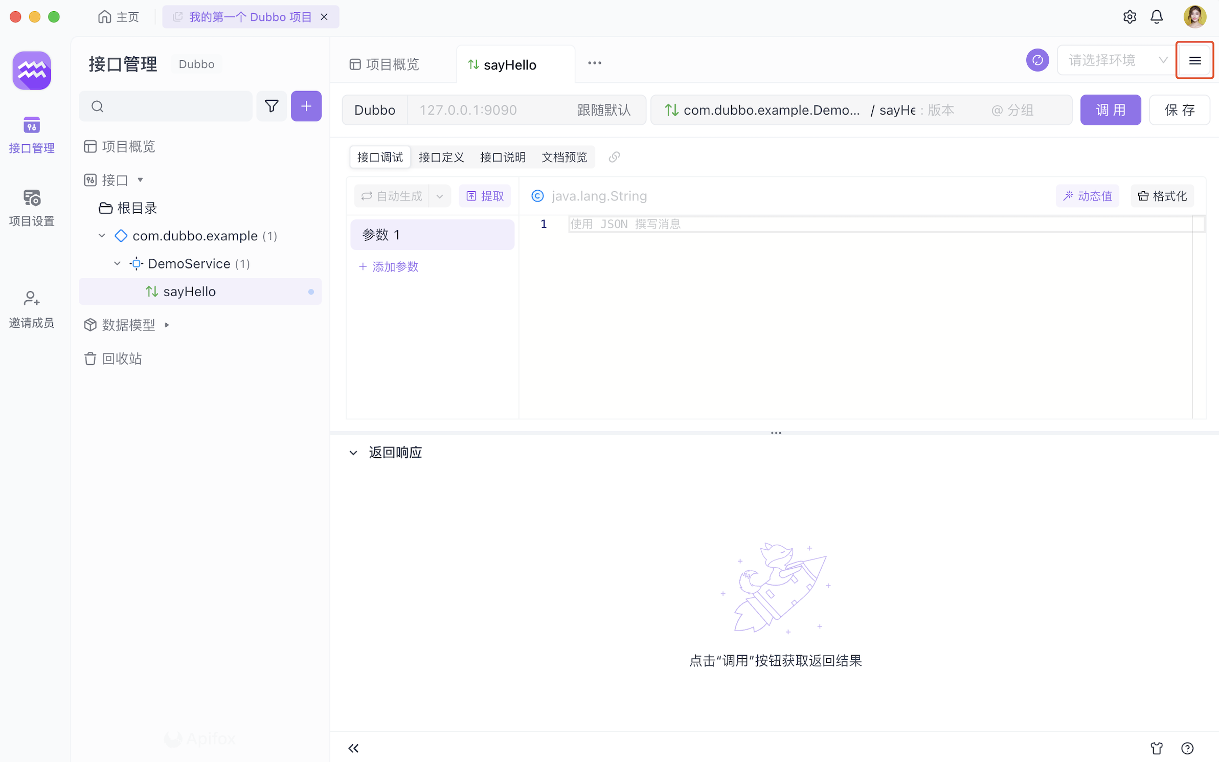 在右上角指定刚刚配置的服务器地址,项目内的其它 Dubbo 接口也将会默认采用该地址。