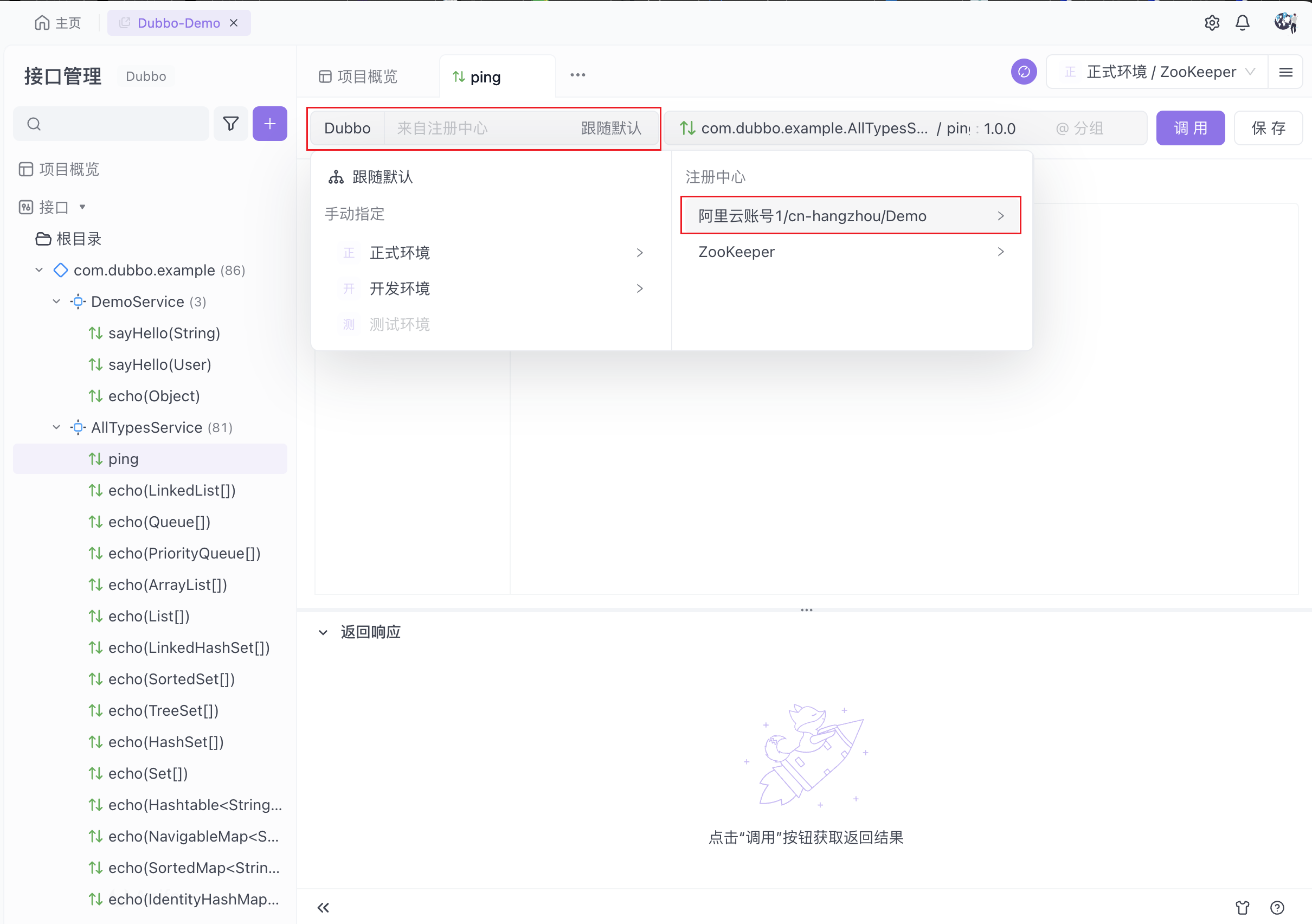 如果需要单独为每个 Dubbo 接口设置不同的注册中心,可以点击接口地址栏,选择环境并手动切换注册中心。