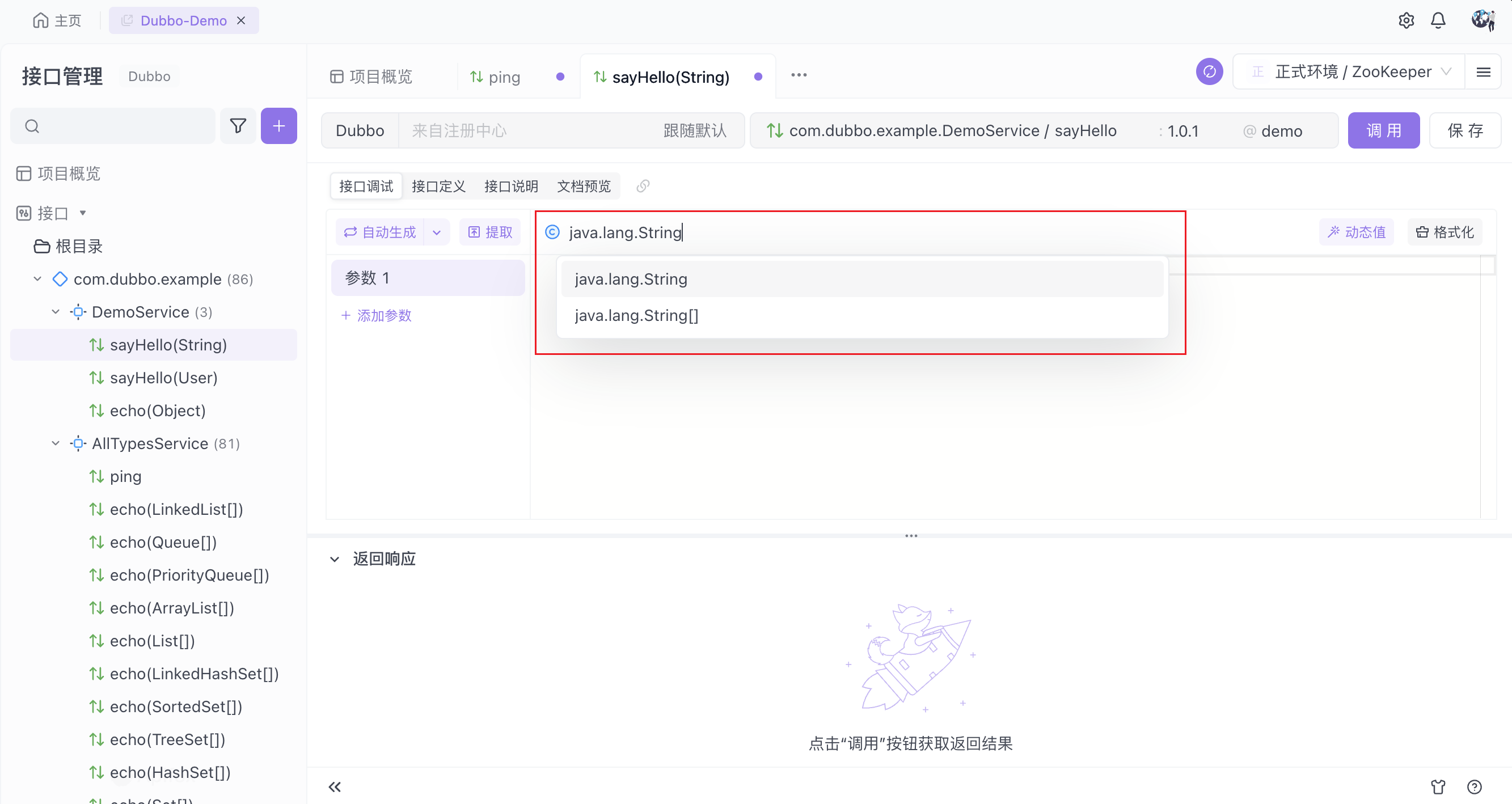开始调试接口前需定义目标服务器地址,你可以通过直连服务器或通过注册中心两种方式进行调试。