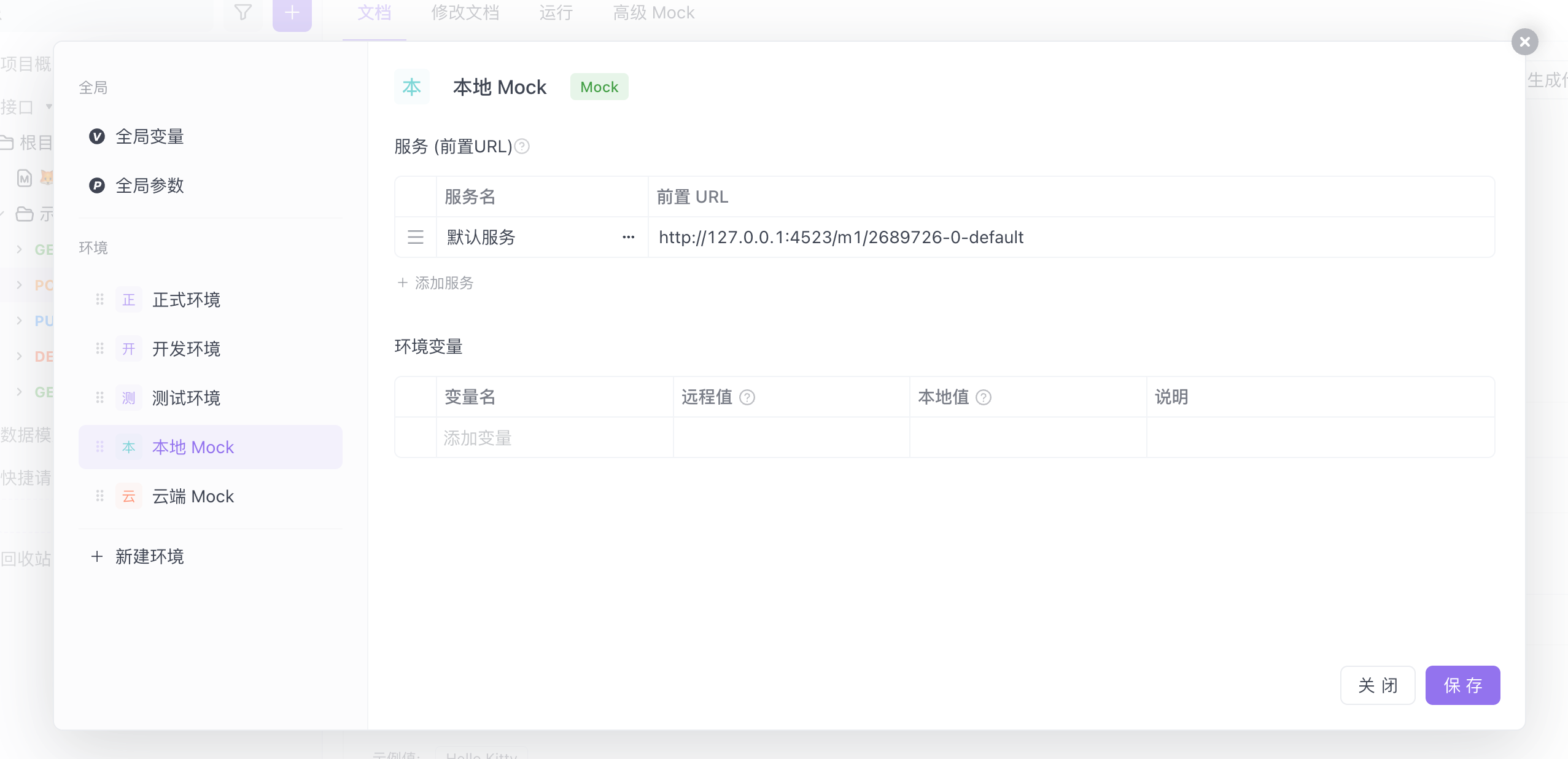 Apifox 默认提供正式环境、开发环境、测试环境、本地 Mock 与云端 Mock。每个环境中包含服务(前置 URL)、环境变量、参数三项可配置项。