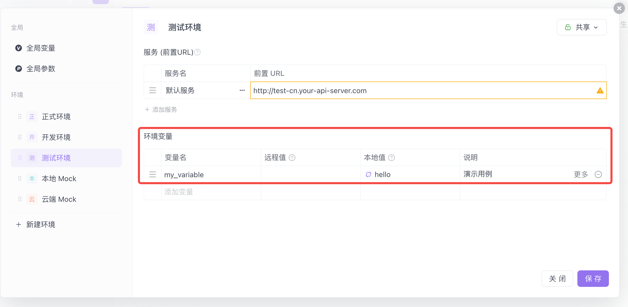 下文将用一个示例说明如何使用环境变量。在“测试环境”中添加一个名为my_variable的变量,并将本地值设置值为hello后点击保存。