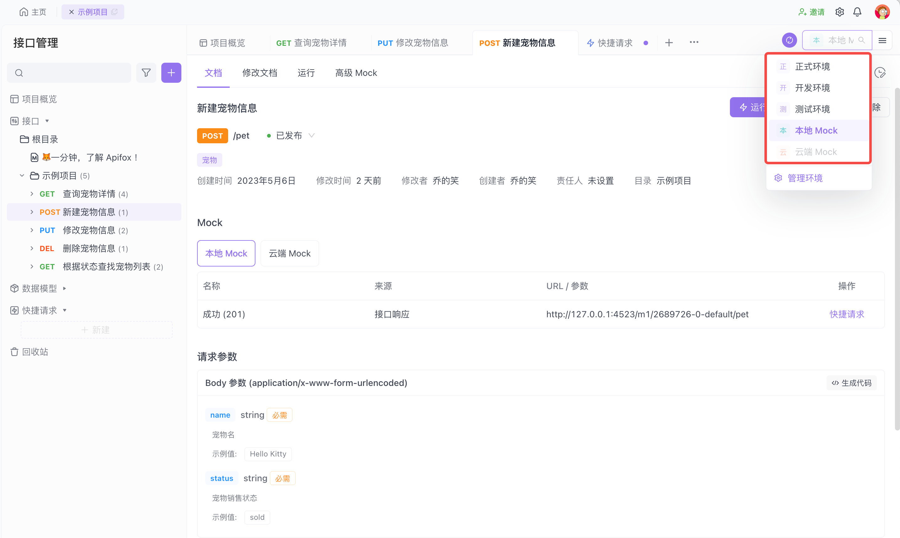 例如在正式环境中设置的前置 URL 为 https://www.api.com,接口路径为 /pets/123,那么实际发送的接口请求 URL 将被自动组合为: https://www.api.com/pets/123。