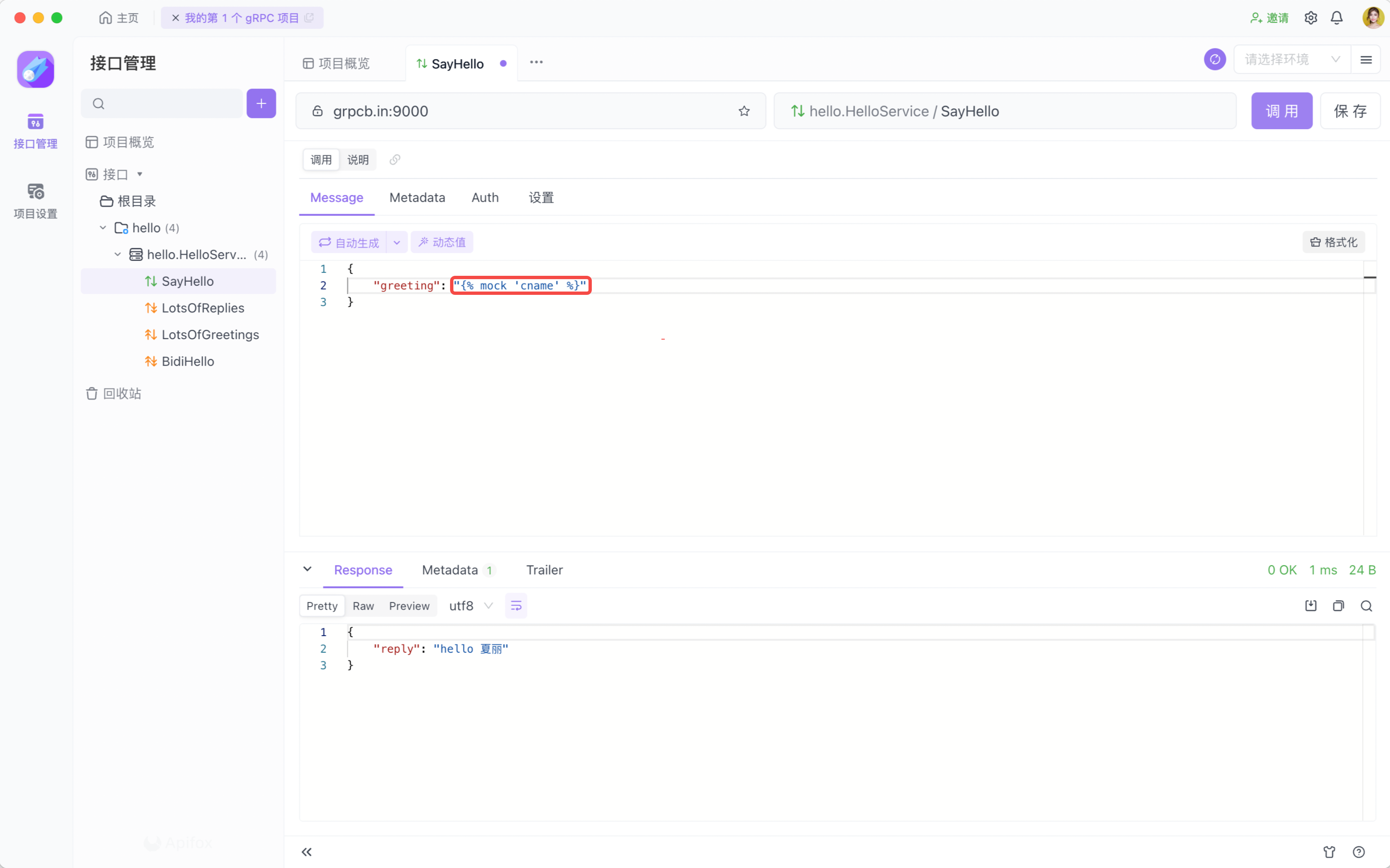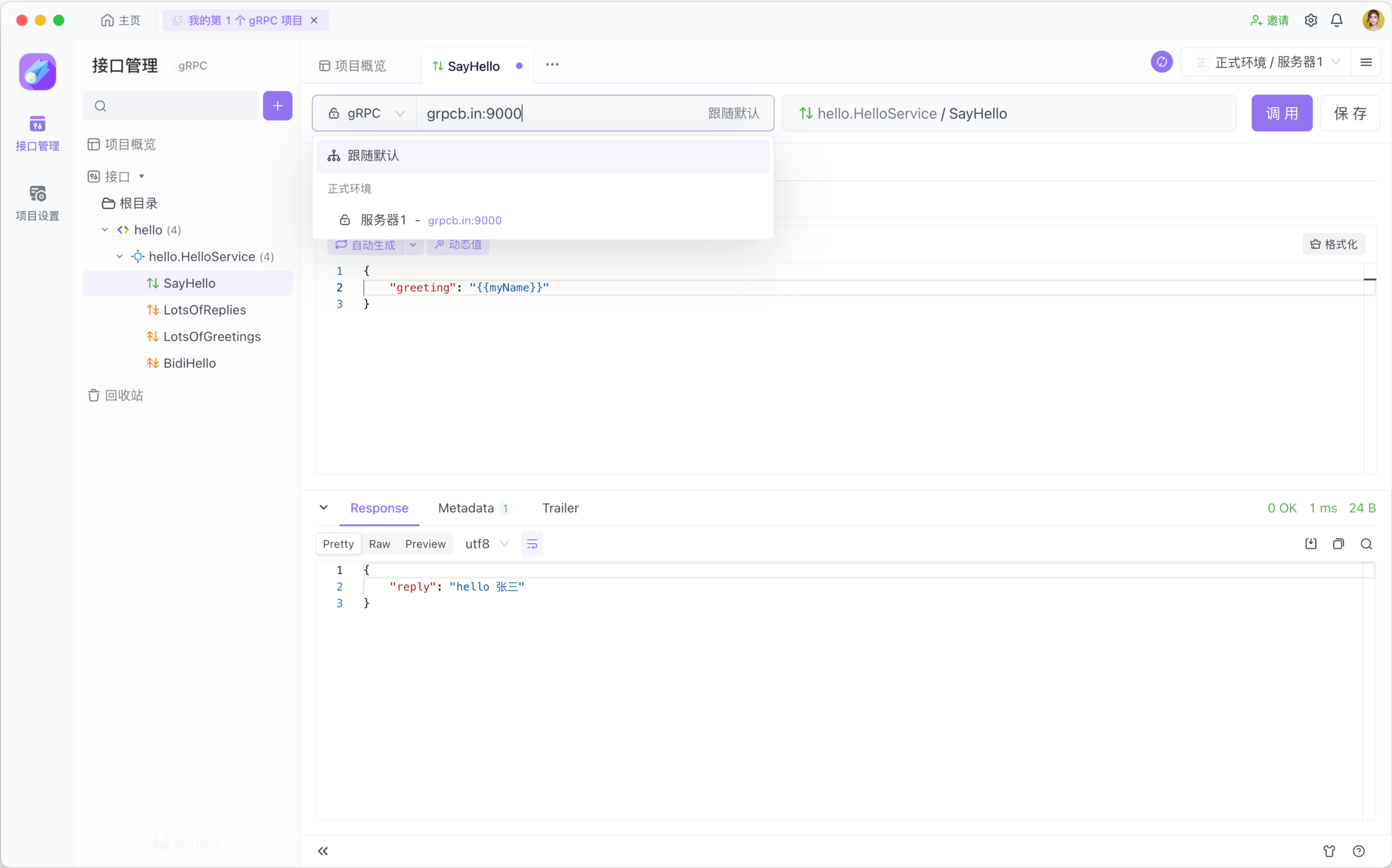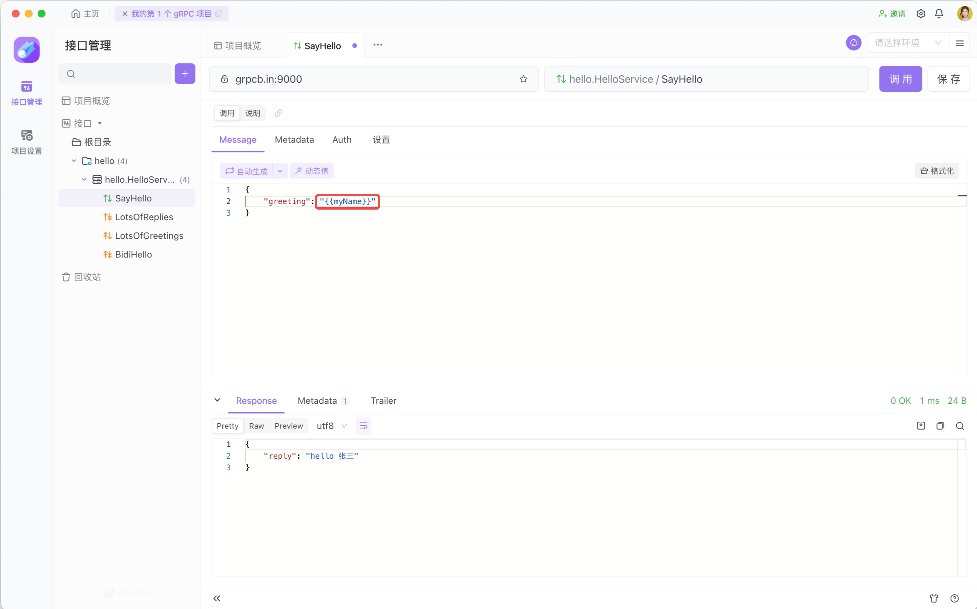 你可以在 gRPC 的消息和 Metadata 中使用 Apifox 变量。