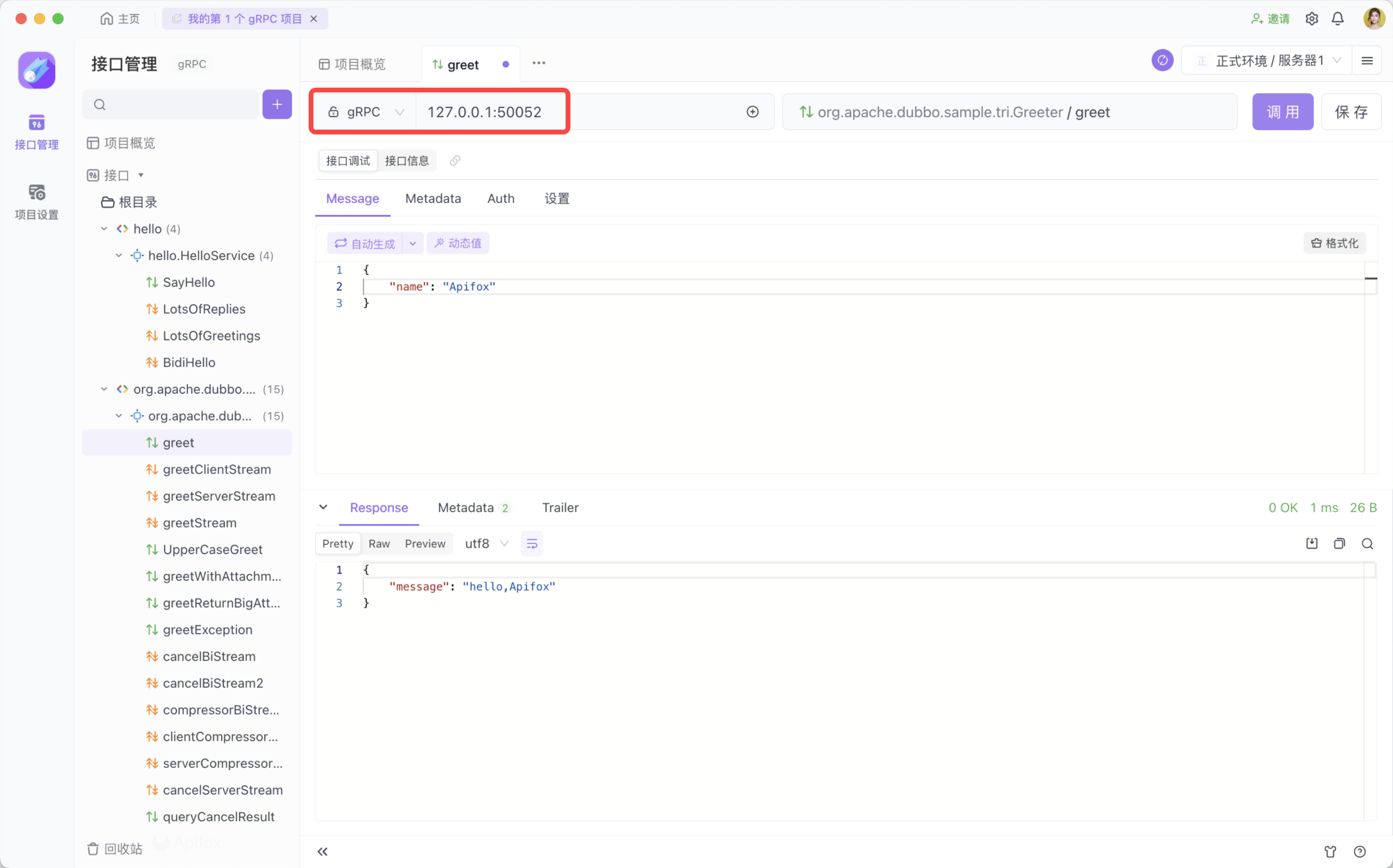 如果你的 Triple 接口通过 .proto 文件进行定义,而不是 Java Interface 或其他方式定义,那么同样可以在 Apifox 的 gRPC 项目中加载 .proto 文件来调试 Triple 接口。