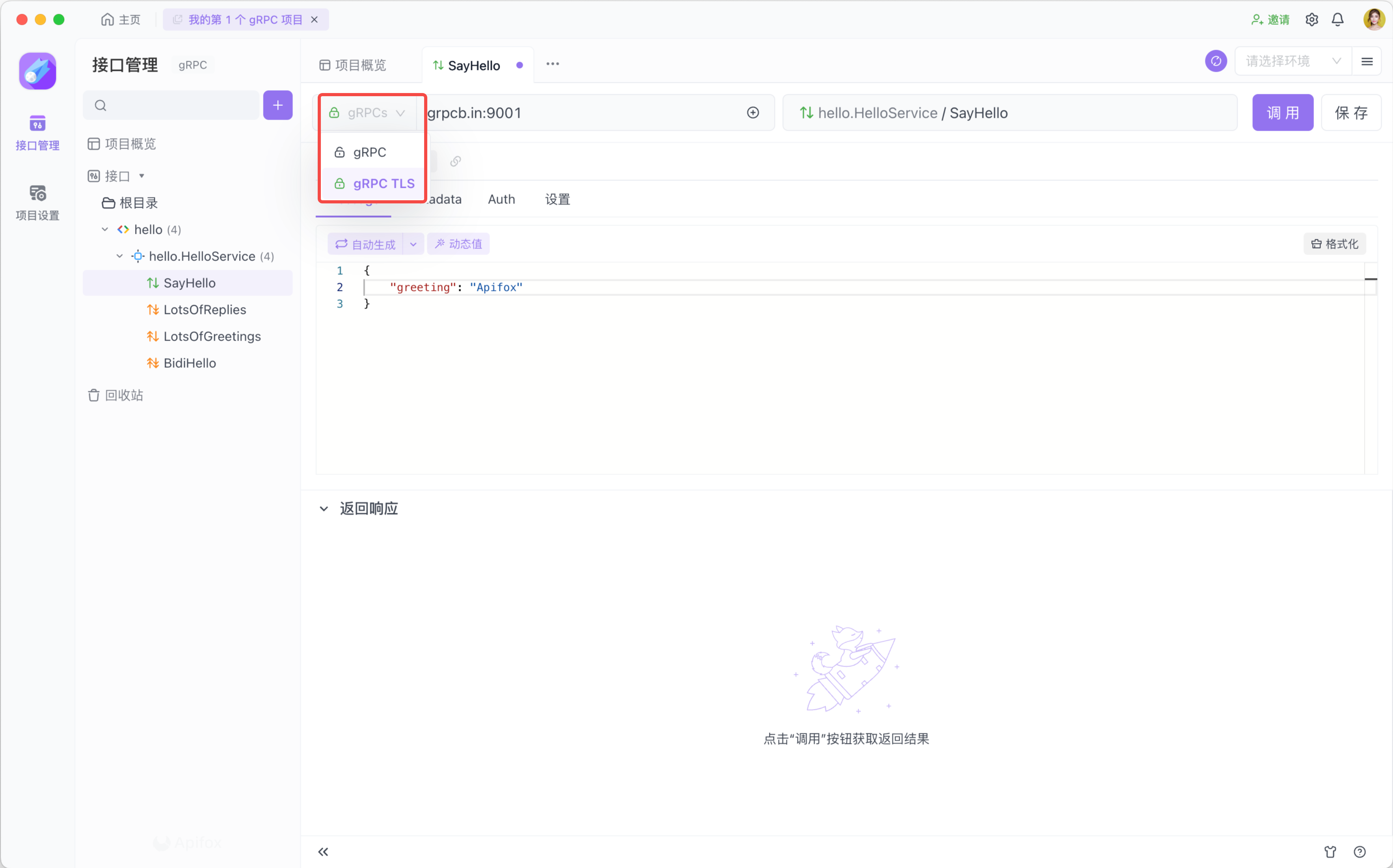 此外,Apifox 也兼容在 URL 中使用 grpcs:// 来为连接启用 TLS。与之相对应,grpc:// 表示不启用 TLS。