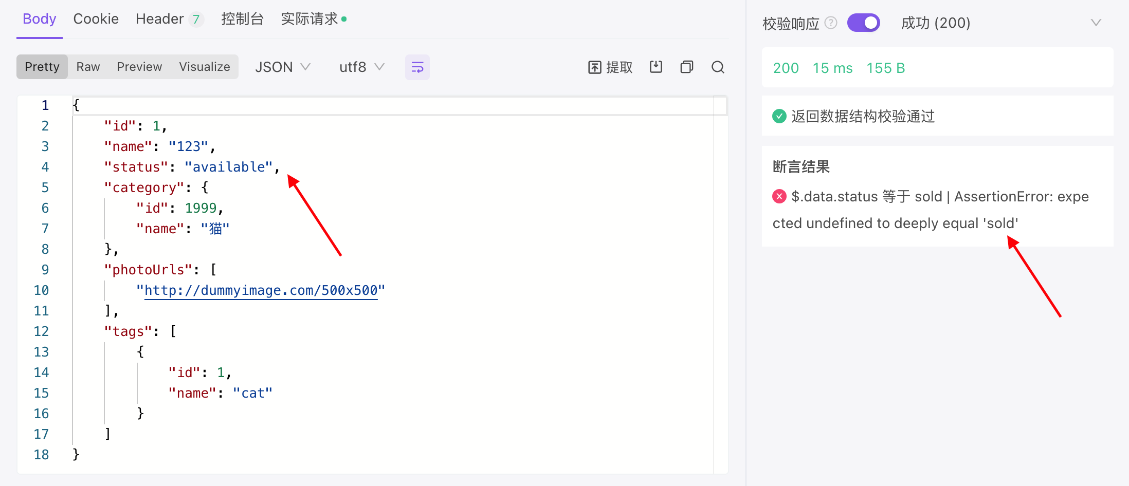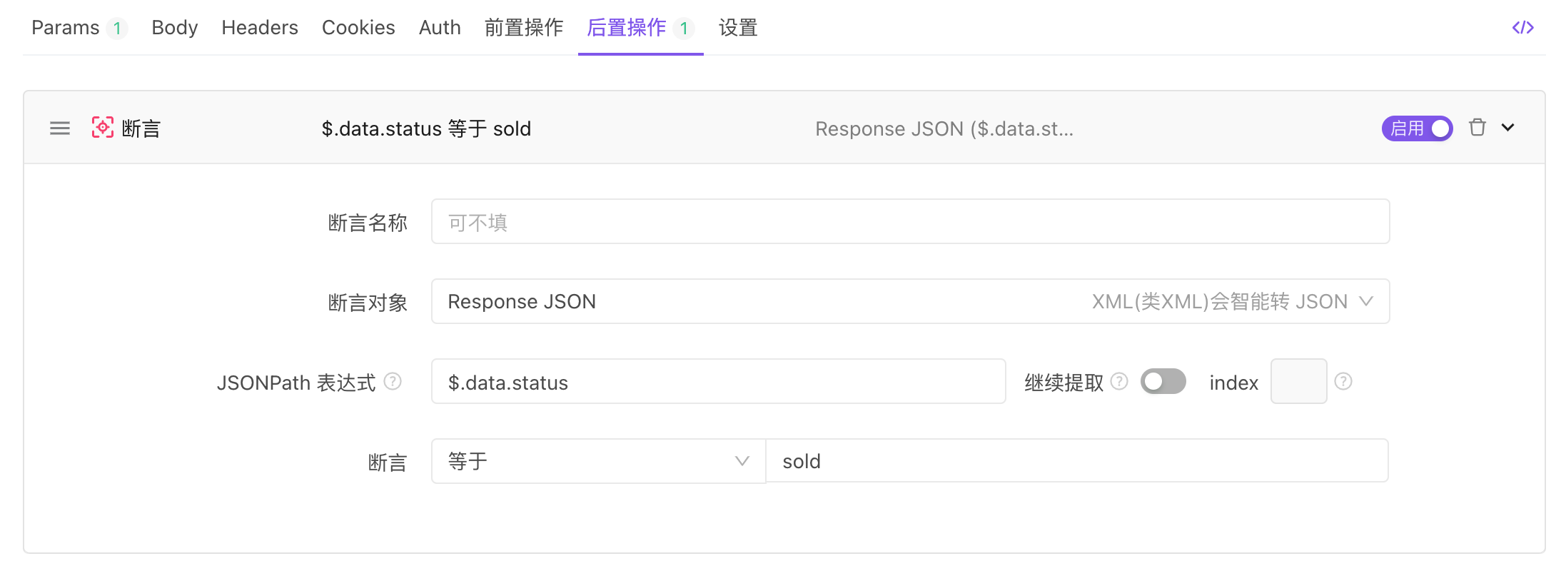 前后置操作 & 脚本断言本页总览断言“后置操作”支持添加断言,你可以对接口返回的数据或响应时间设置断言,以判断当前接口返回是否符合预期。设置断言打开 Apifox 中的某条接口,在“后置操作”页中设置断言。例如输入 $.data.status。提示根对象使用 $ 符号进行表示,而无需区分是对象还是数组。查看结果运行后即可查看断言结果: