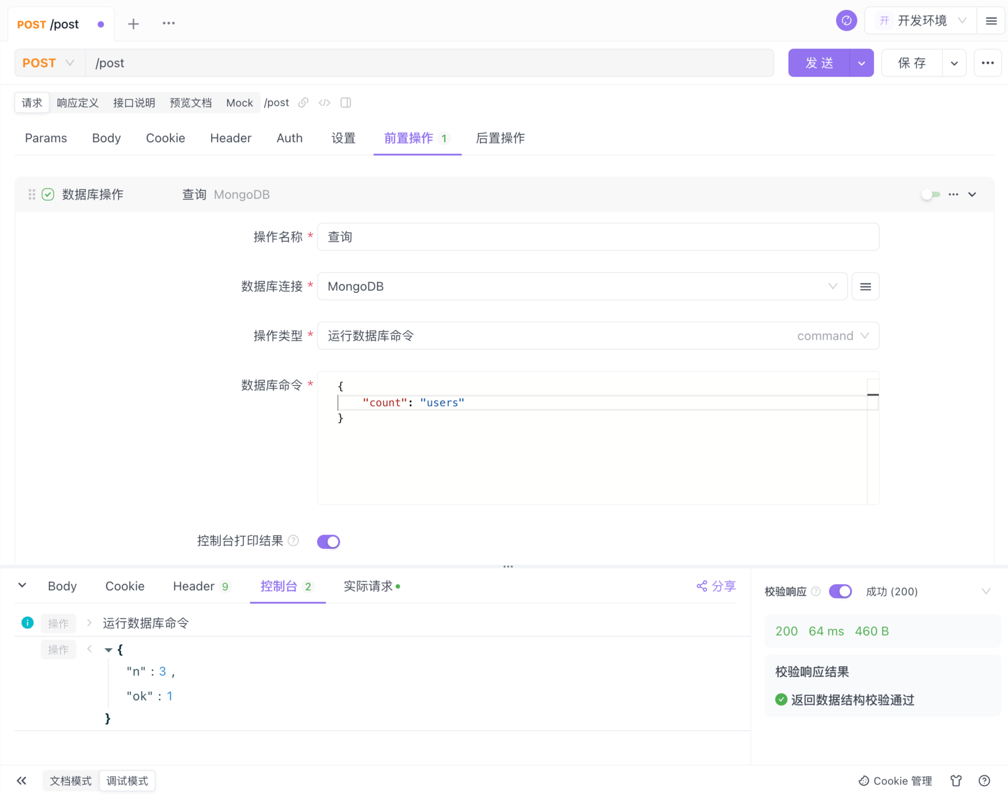 - 点击接口中的“前置/后置操作“,选择“数据库操作”。