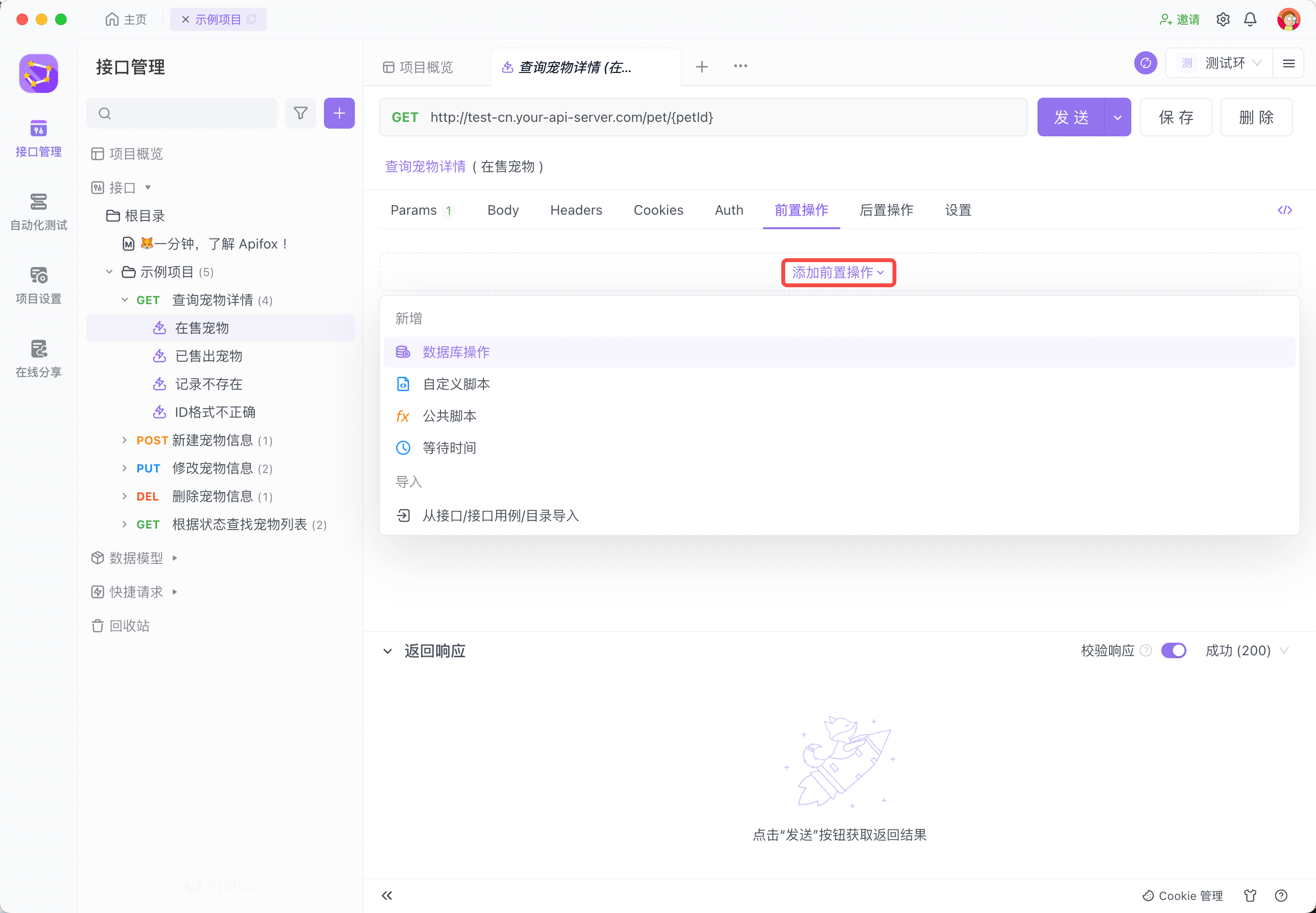 你可以在接口的“前置操作” tab 页中添加前置脚本,发送接口请求前将自动运行前置脚本。