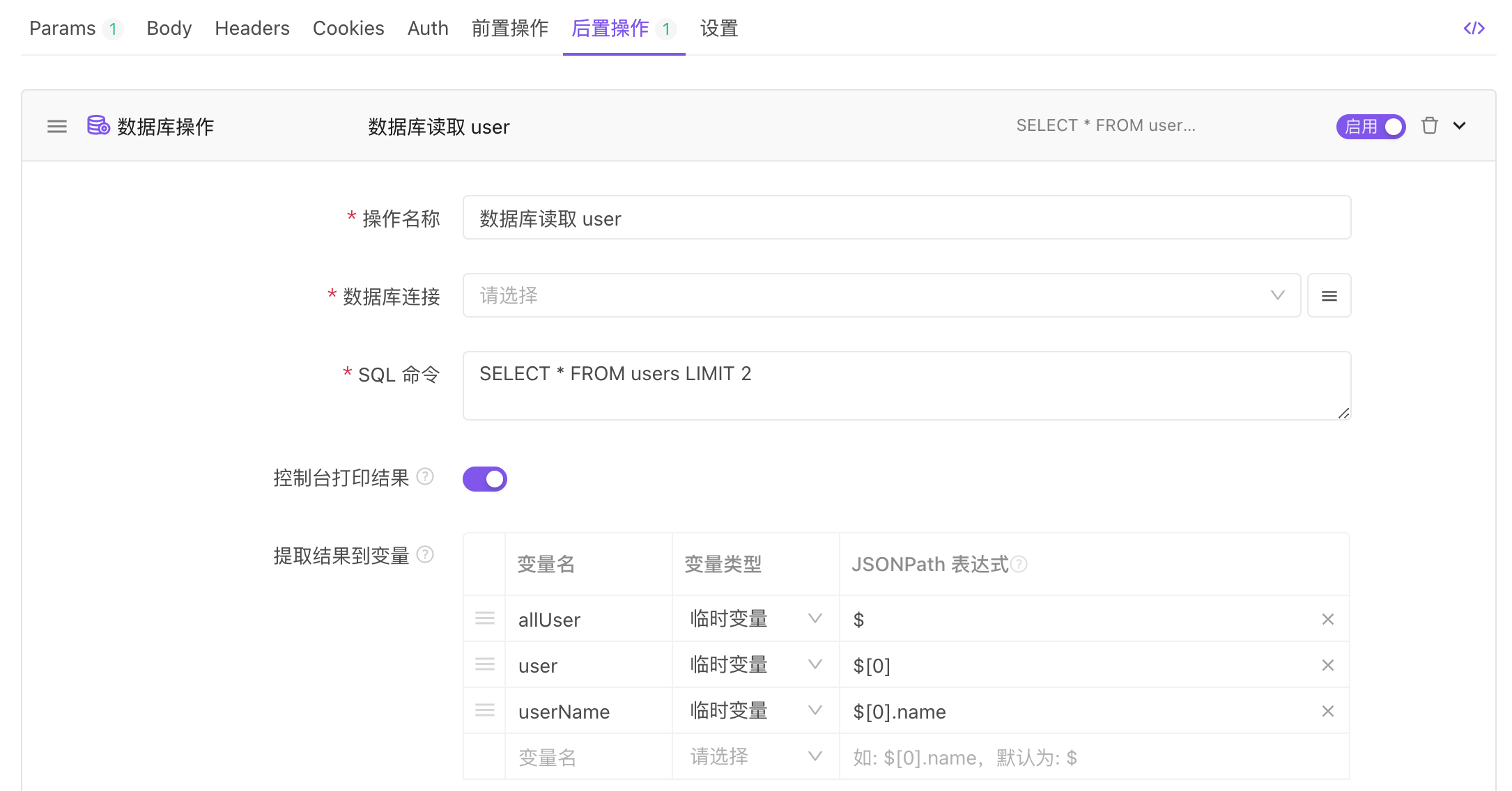 “前置/后置操作”支持添加数据库。查询结果可在接口请求参数、断言、自定义脚本等场景中使用,还支持读写数据库。目前支持 MySQL、SQL Server、Oracle、PostgreSQL 四种数据库类型。