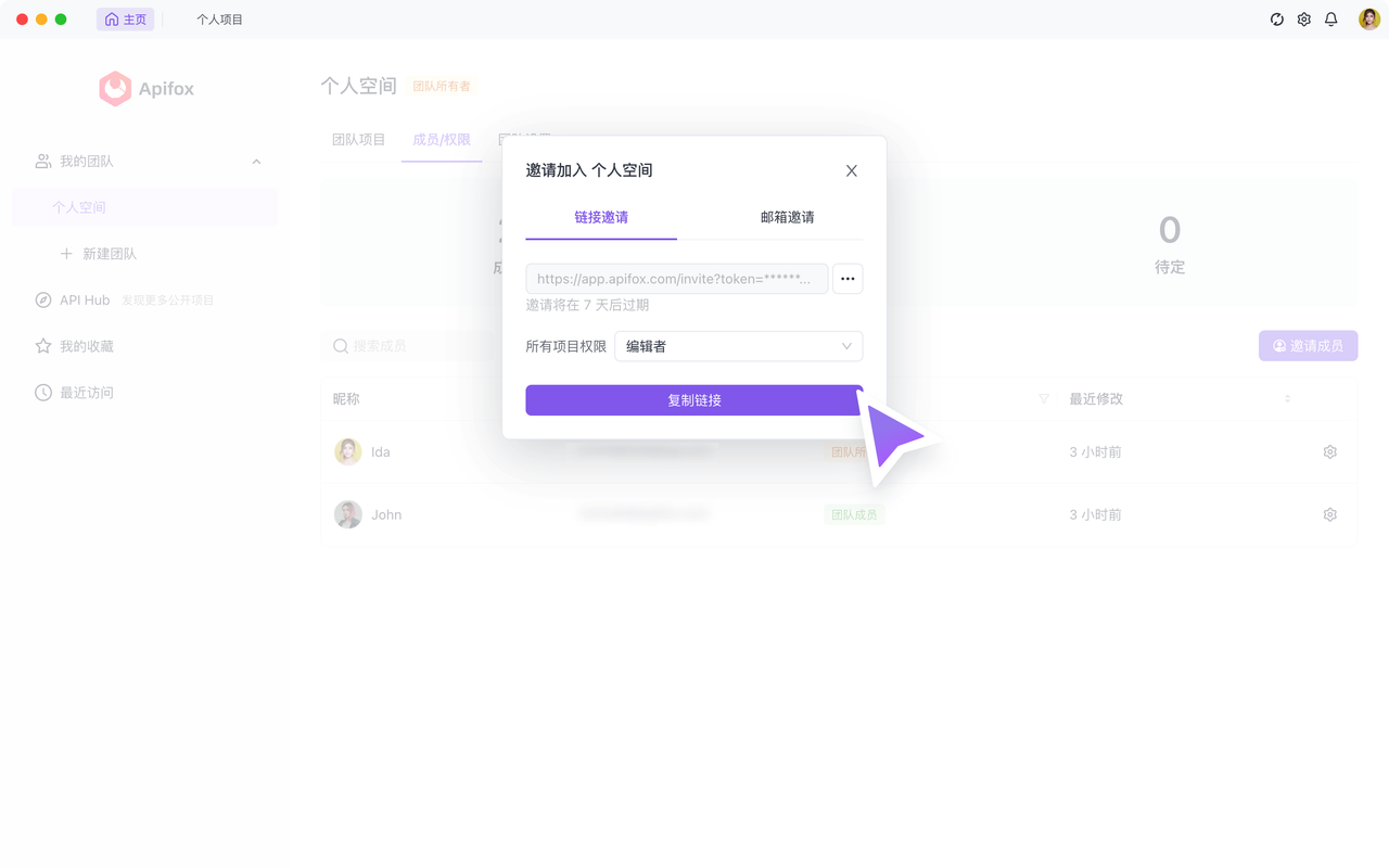 Apifox 提供了两种邀请方式,让你方便地邀请团队成员: