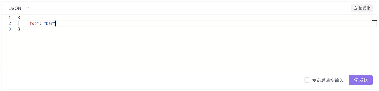 编辑器会根据所选的消息格式,对消息内容进行语法高亮。如果消息是 JSON、XML 或 HTML 格式,还可以对输入的内容进行格式化操作。